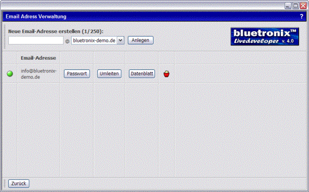 Le logiciel bluetronix comprend également une fonction e-mail. Ici, les adresses e-mail peuvent être créées ou redirigées pour correspondre au domaine. Avec le webmailer inclus, les e-mails peuvent être lus et écrits directement en ligne. Toutes les boîtes aux lettres prennent en charge POP3, STMP et IMAP. Ainsi, les e-mails peuvent être consultés dans Outlook, dans Thunderbird ou même sur un PDA ou un téléphone portable.